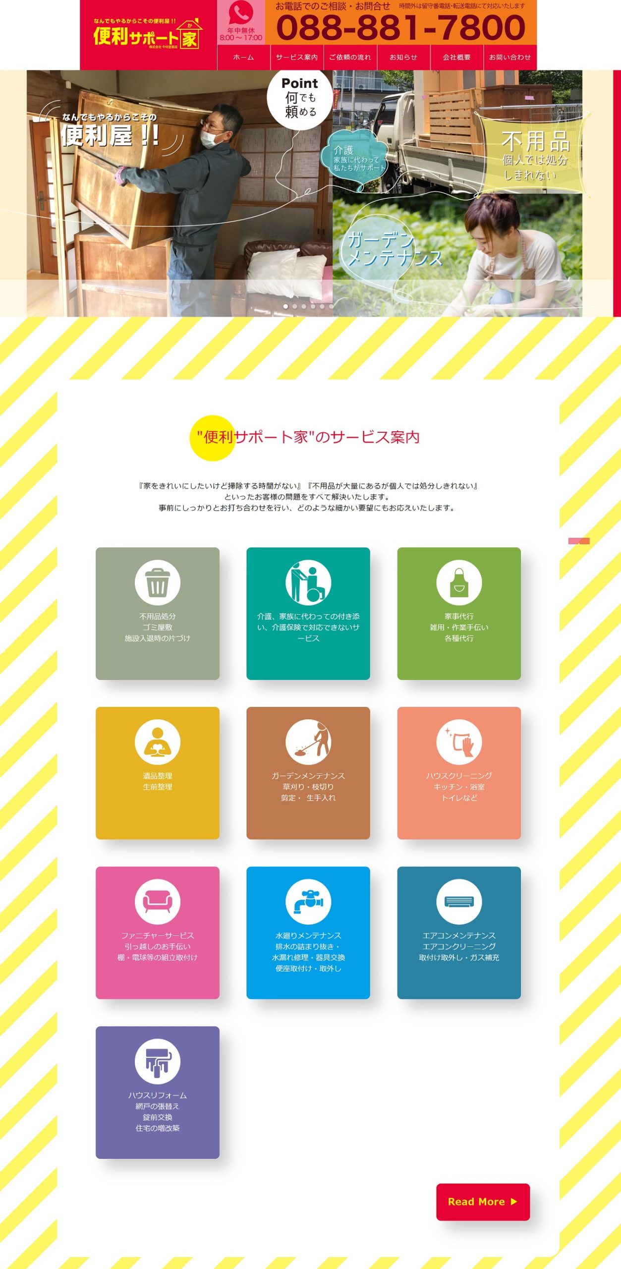 介護に関する用事や不用品処分などを依頼できる便利屋さんサイト便利サポート家様。 明るく元気なイメージで、親しみやすさと分かりやすさを重視し、構築しました。 お客様のお声 『お客様の思いを汲み心からワクワクするホームページ…
